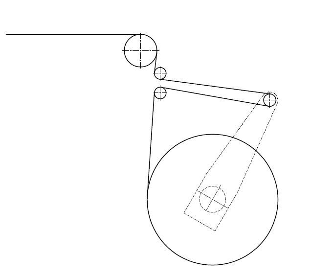 卷料回收方式由卷料電機、檢測開關(guān)等組成。自然狀態(tài)下電機轉(zhuǎn)動,當擺臂下降觸碰到檢測開關(guān)后,電機停止轉(zhuǎn)動。下一個步進后,擺臂上揚,電機轉(zhuǎn)動,擺臂下降碰到檢測開關(guān),如此反復(fù)。邊料纏繞方式如右圖所示。